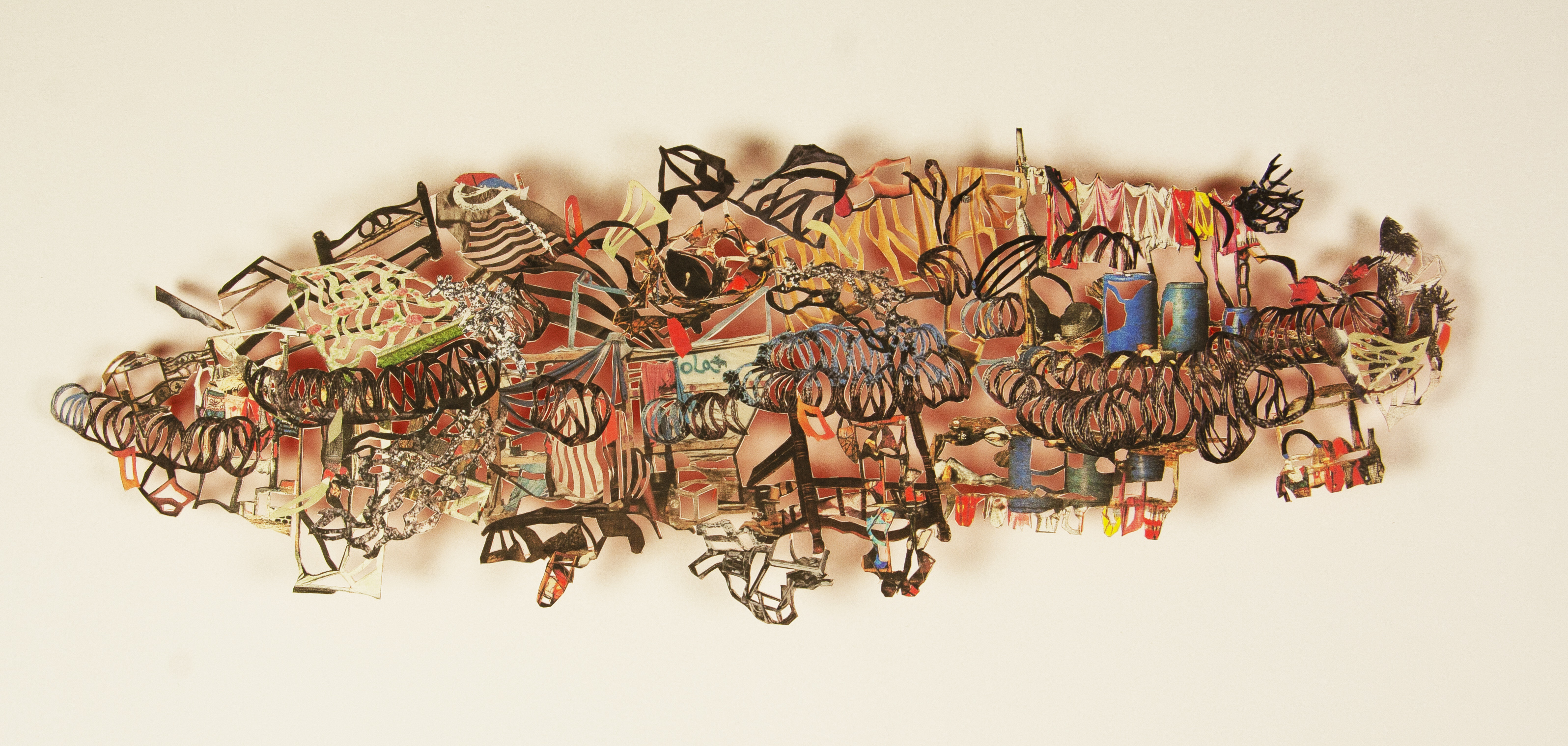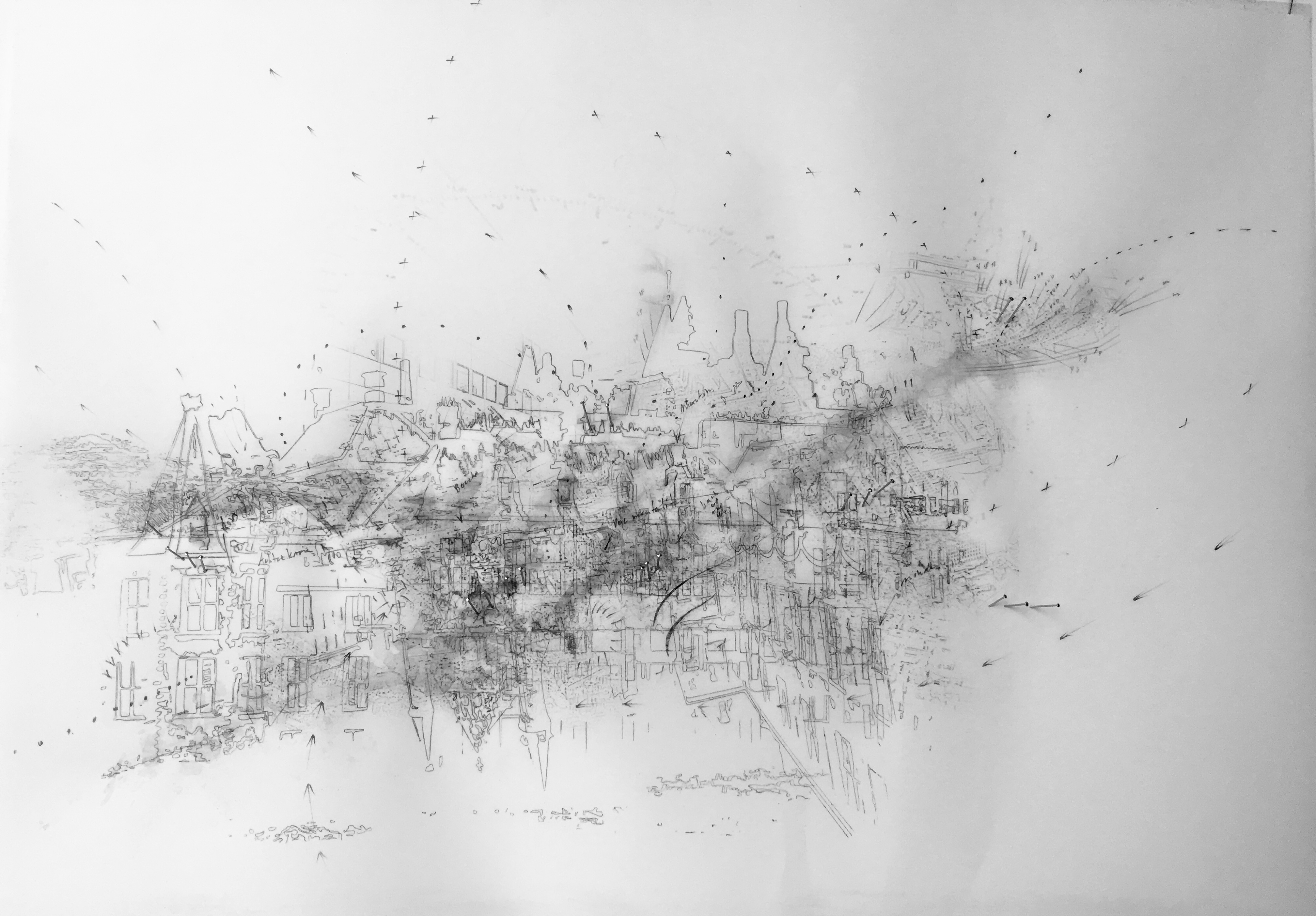 In zijn huidige atelier ligt het materiaal nog altijd op de vloer. De serie tekeningen die Allie toont bij Galerie Noord is op die vloer ontstaan tijdens de coronacrisis.