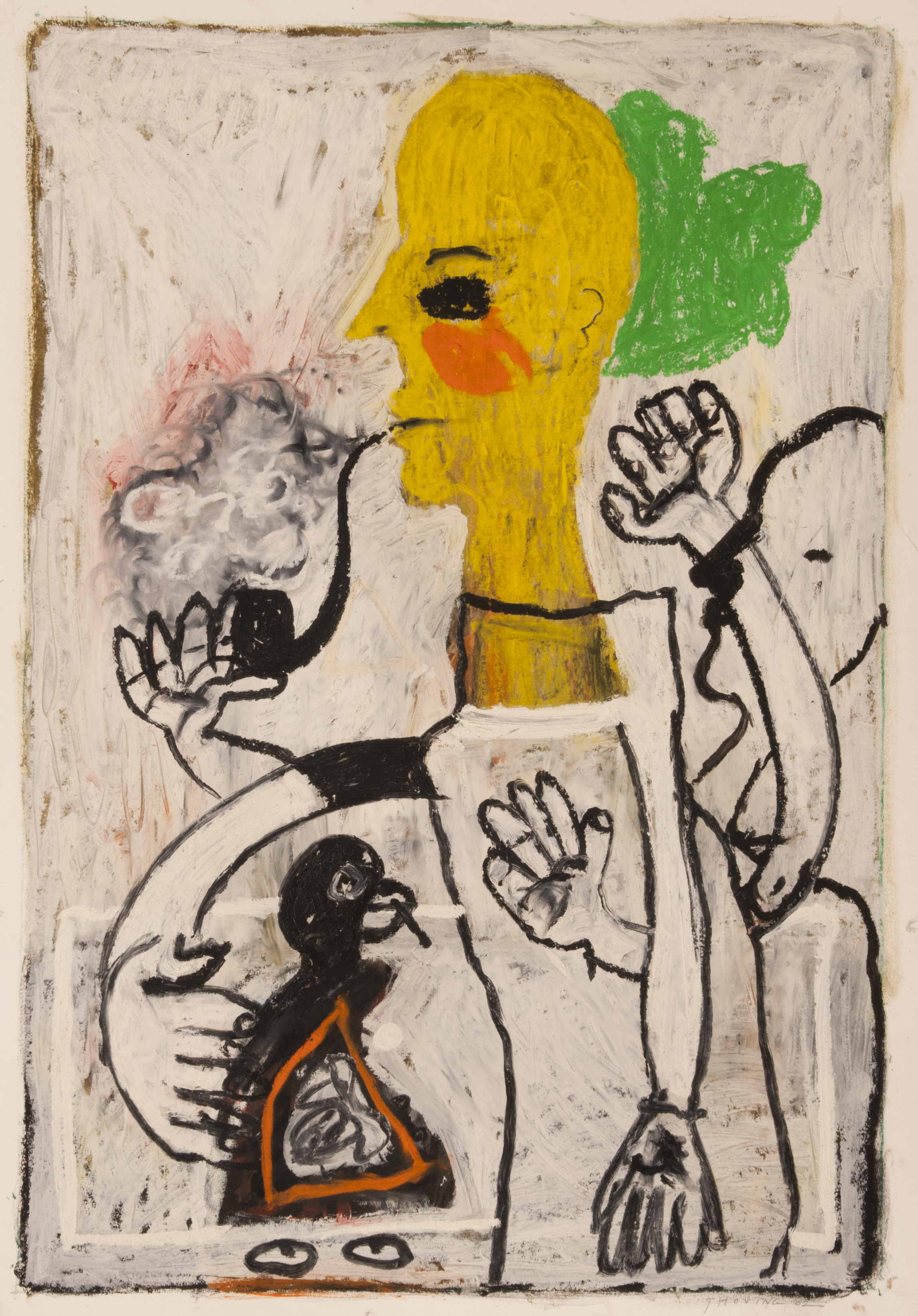 Begin jaren ’80, na een conceptuele manier van werken, besluit Jan Hoving, geïnspireerd door jonge neo-expressionistische kunstenaars, zoals ‘de Jonge Italianen’ en de ‘Nieuwe Wilden’, vrijer en spontaner te werken. Daarbij maakt hij gebruik van zogenaamde ‘oilsticks’, olieverf in de vorm van dikke krijten. Niet gehinderd door penseel of paletmes, werkt hij in figuratief-expressionistische stijl direct met zijn handen.
